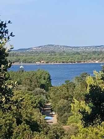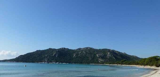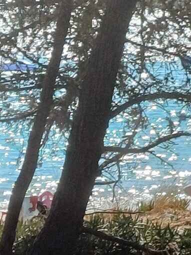 Comme nous sommes assez en retard, à cause du détour à Piranellu, nous avons du mal à trouver une place ombragée dans le sable sous les arbres, mais je suis très têtue dans ce genre de situation et je suis une fois de plus récompensée par cette belle vue sur la mer à travers les arbres.