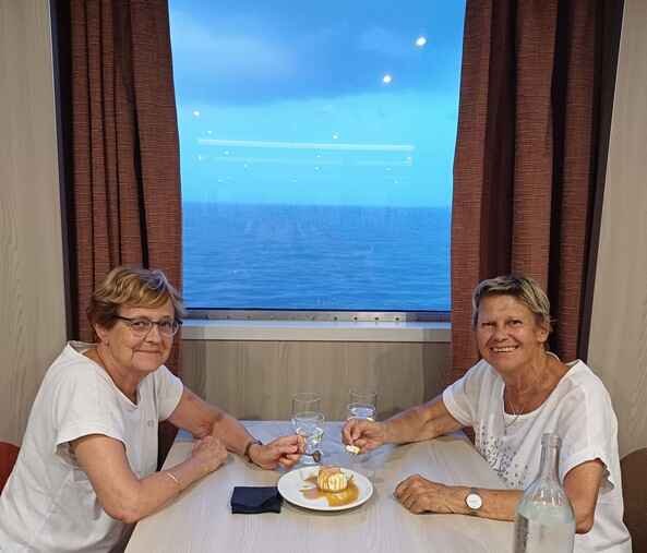 Nous quittons le port et passons devant la « Bonne Mère », l’emblème de la ville, prenons l’apéritif sur le pont, puis attendons sagement, pratiquement les premiers, dans la file qui se forme devant le restaurant du bord. Nous obtenons ainsi la plus belle table près de la fenêtre et un repas très savoureux, suivi par un dernier verre pendant le coucher du soleil sur la mer. C’est beau!