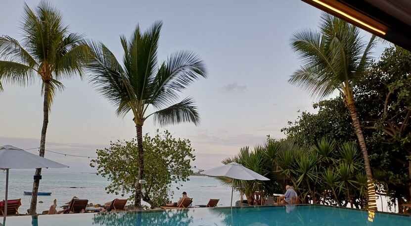 Wir liegen einigermaßen erschöpft von der langen Reise, doch gleichzeitig verblüfft und glücklich über diese fabelhafte Aussicht auf den Indischen Ozean, eingekuschelt auf den weichen